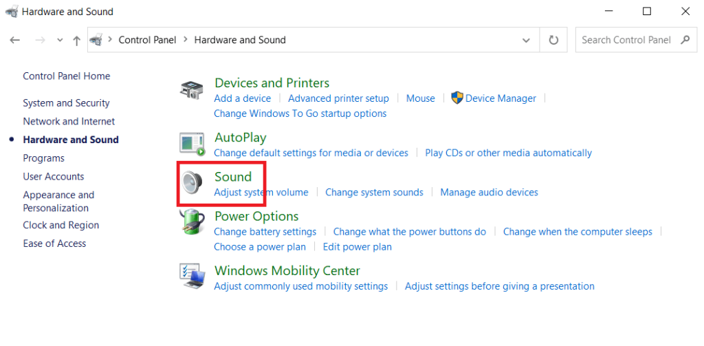 2. [表示]> [カテゴリ]を設定し、[ハードウェアとサウンド]オプションをクリックし ます。